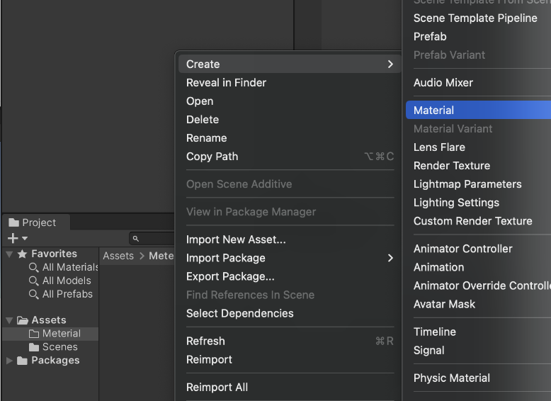 프로젝트에서 우클릭 > Credat > Meterial